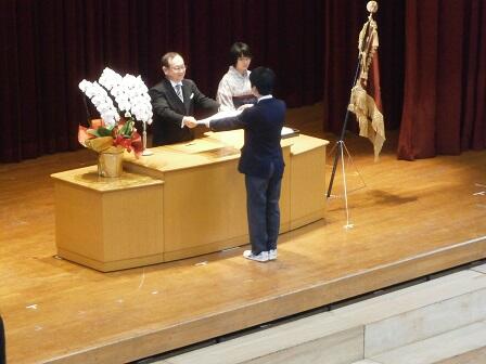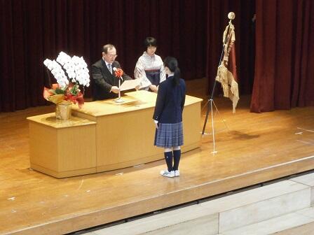 式では、それぞれの学年の代表生徒による今年度のふり返りと、来年度の決意が発表され、校長先生から、修了証が手渡されました。