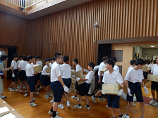 1日目の日中には、物資の搬送や仕分けを行い、仮設トイレの組み立て方なども学びました。その日の夜には、多摩中学校の生徒、多摩市の職員、地域住民の方々が一堂に会し、HUG(避難所運営ゲーム)訓練を行いました。実際に避難所となったことを想定した活発な意見交換がなされました。その後、多摩中生は各教室に分かれ、皆が心地良く過ごせるよう気を配りながら就寝しました。