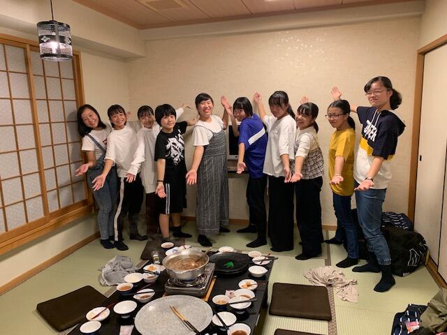 京都駅からはバスで、A・C組は宇治の平等院、B組は法隆寺、D・F組は薬師寺に向かいました。その後、全クラスが奈良公園に集まり、東大寺の大仏や興福寺、春日大社など見学し、奈良公園の鹿と戯れました。京都に戻り、大江能楽堂で能体験をしました。宿に着いてからは京風すき焼きをおなか一杯食べ、就寝までの時間、部屋や地下の大広間で楽しい時間を過ごしました。