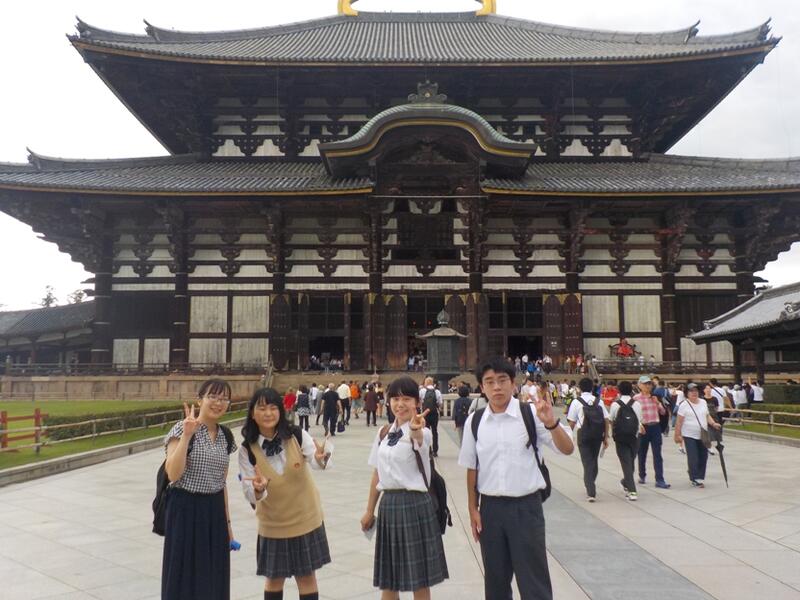 京都駅からはバスで、A・C組は宇治の平等院、B組は法隆寺、D・F組は薬師寺に向かいました。その後、全クラスが奈良公園に集まり、東大寺の大仏や興福寺、春日大社など見学し、奈良公園の鹿と戯れました。京都に戻り、大江能楽堂で能体験をしました。宿に着いてからは京風すき焼きをおなか一杯食べ、就寝までの時間、部屋や地下の大広間で楽しい時間を過ごしました。