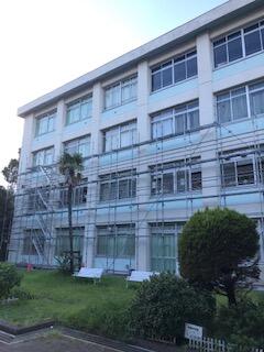 特別教室棟のエアコン工事のため、足場が作られ始めました。エネルギーを大切にしながら、熱中症の予防も進めていきましょう。一緒にカーテンも新調した教室もあります。
