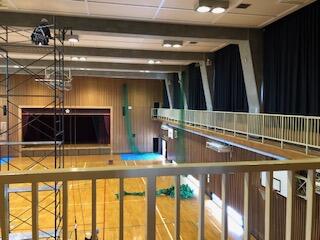 体育館を半分に仕切るネットのワイヤーが傷んでいたので、工事進行中。新規張り替えで◯◯万円也。