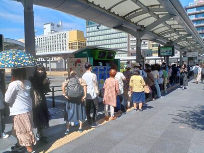 京都駅から清水寺・三十三間堂方面に向かうバスは50メートルを超える長蛇の列でした。