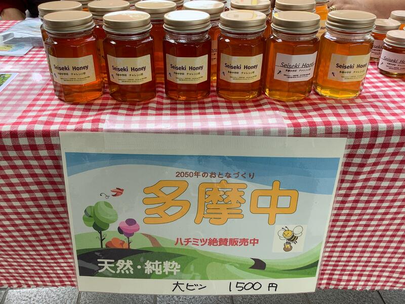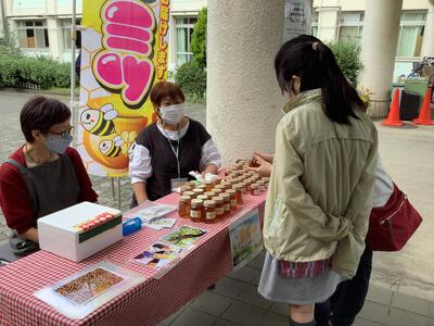学校公開に合わせて、地域学校協働本部の方々のご協力で多摩中の養蜂活動で採れたハチミツの販売を職員玄関前で行っています。体育祭の時に購入いただけなかった方は、是非お越しください。