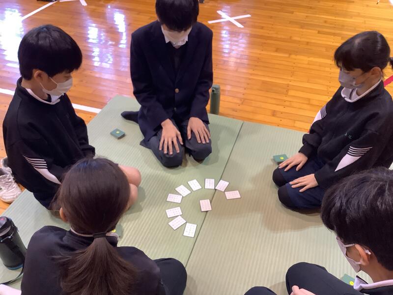 本日、談話室にてF組の百人一首大会が行われました。6つのグループに分かれての対戦となりましたが、30枚以上も取る生徒もおり、どのグループもとても白熱したものになりました。