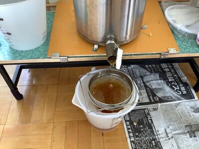 本校の大きな特徴である養蜂活動において、昨日は採蜜が行われました。土曜日にチャレンジ部と地域の方々で行う予定であったものが、当日の雨により延期となってしまったものです。午前中の活動のため、残念ながら生徒は参加できませんでしたが、地域学校協働本部の方々を中心に地域の皆様が参加してくださり、無事終えることができました。今回は、味•風味•糖度(何と糖度83度!)等においてとても良い状態のハチミツとなりました。この養蜂活動を通じて、ESDやSDGsの学びに役立てられています。なお、この収益により、地域学校協働本部の皆様からは、体育祭用の生徒席テントや教室のエアコン、教室の投影用スクリーンなどの寄贈をしていただいています。このハチミツは昨年に引き続き、せいせき朝顔市など、地域の行事などで販売される予定です。