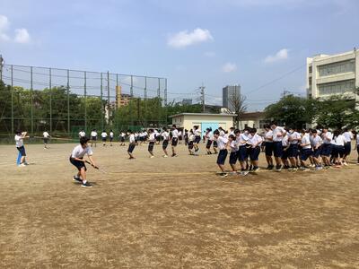 本日の6時間目に体育祭前の最終練習となる全校練習が行われました。種目は、ブロック対抗大縄跳び。全体での練習時間をとった後、本番と同じように対抗戦形式で行いました。練習から集中力が高く、競技中はどの色も声をからさんばかりの応援で、大いに盛り上がっていました。競技が終わった後には、体育的実行委員が素早く用具を片付け、チームのみんなをしっかりと並ばせていました。