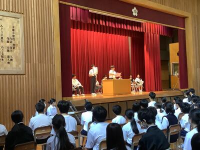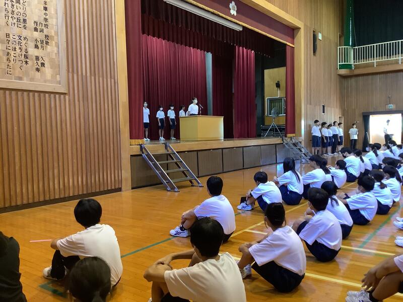 今学期最初の全校朝礼が行われました。生徒はしっかりと前を向き、きちんと集中して話を聞けていました。講話では、まずは自分を活かせる場面で力を発揮していこうということ。そして、その中で、集団の成長と自らの成長のために、今自分ができることは何かを考えて、自ら主体的に行動してほしいと話しました。
