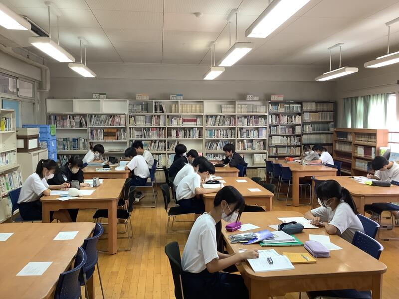19日からの定期テストに向けて、本日より図書室が自習室として開放されました。図書室が二間続きになっている特性を活かして、図書の貸し出しと同時並行で行えています。今日は初日でしたが、多くの生徒の利用がありました。