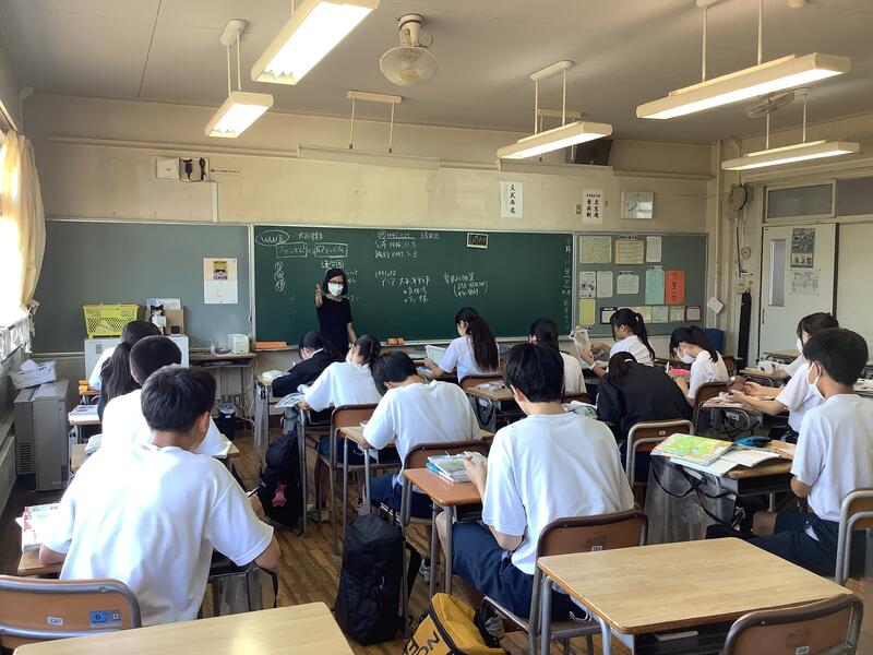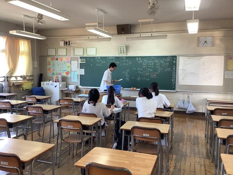 地域未来塾は、主に毎週水曜日に行われています。苦手な分野の克服に向けて、今年度は英語と数学の2つのコースが開かれています。今日は2年生が職場体験で不在なため、生徒二人に指導者が一人というとても手厚い状況での学習になりました。