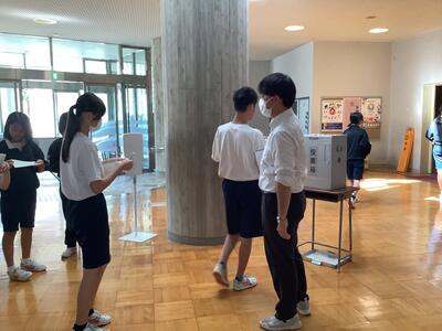 5年度後期から6年度前期を任期にした生徒会役員選出のための立会演説会と投票がありました。現生徒会長からの呼びかけに続き、10人の候補者がそれぞれの思いをスピーチに込めました。演説の後は、正式な記載台を使用して投票が行われました。