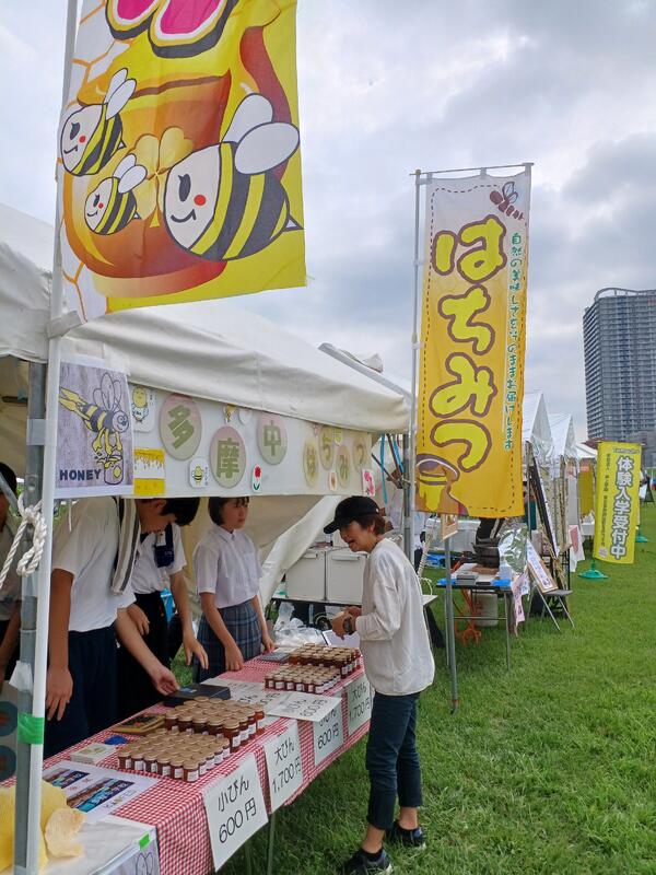 一ノ宮公園(多摩川河川敷)で開催されているKAOフェス2023に、チャレンジ部の生徒が地域学校協働本部の方々と一緒に、多摩中でとれたハチミツの販売を行っています。お昼12時までの予定ですが、無くなり次第終了となりますので、お早めに!