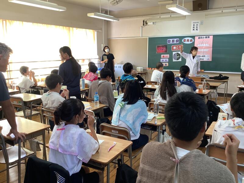 先日のF組に引き続き、今日は1年生がブラッシング教室を受講しました。前半は歯周病や虫歯の予防についてのお話しがあり、後半は染め出し液を使って歯磨きの状況(歯垢の残り具合)を確認しました。