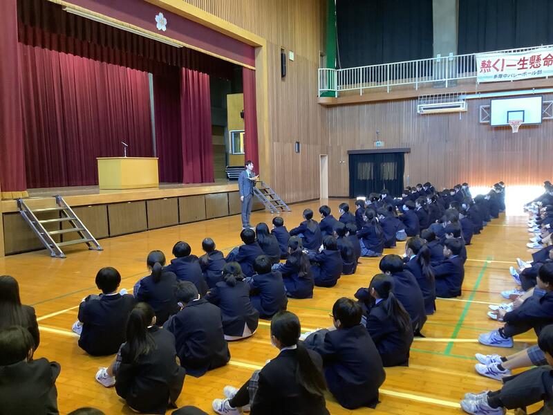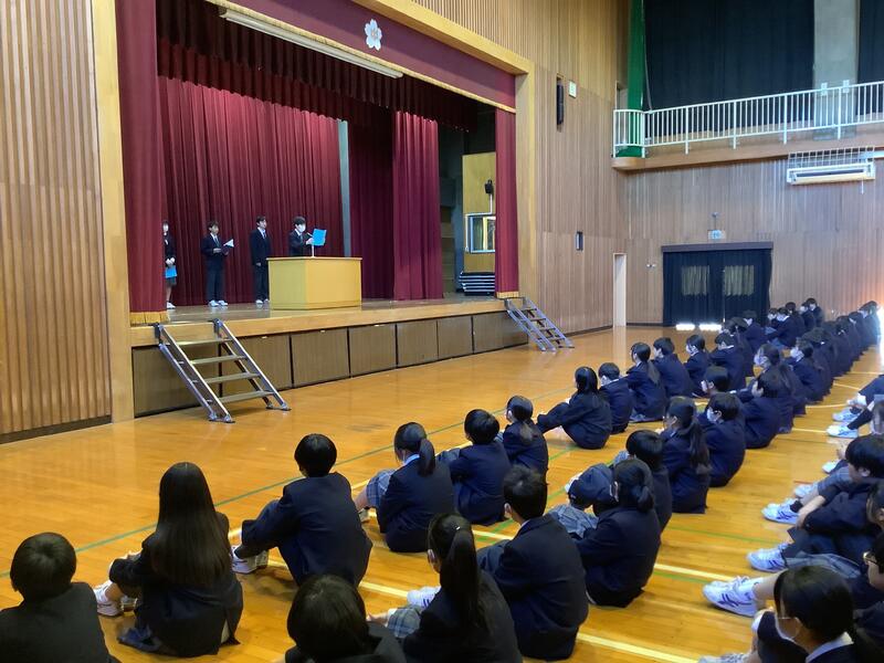 終業式では、校歌斉唱の後、F組と各学年の代表者が2学期の成果を発表してくれました。発表の態度はもちろん、代表生徒の発表内容はどれも大変立派なものでした。終業式後には、卓球部•バレーボール部•陸上部•税の標語の表彰がありました。