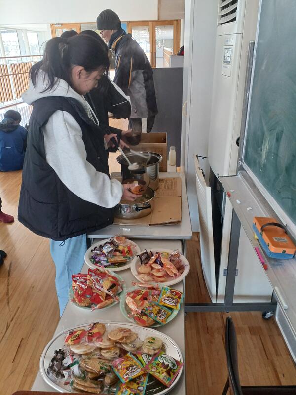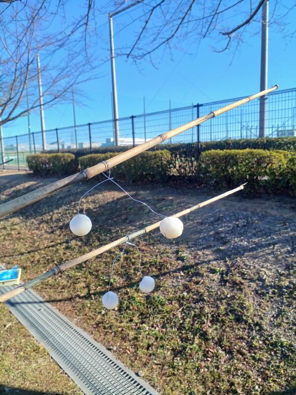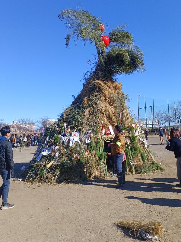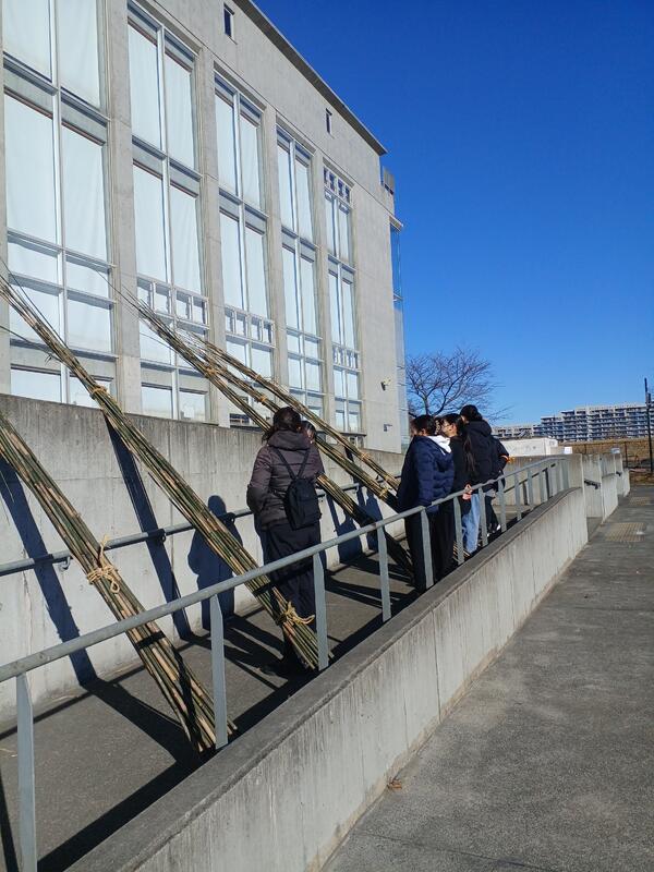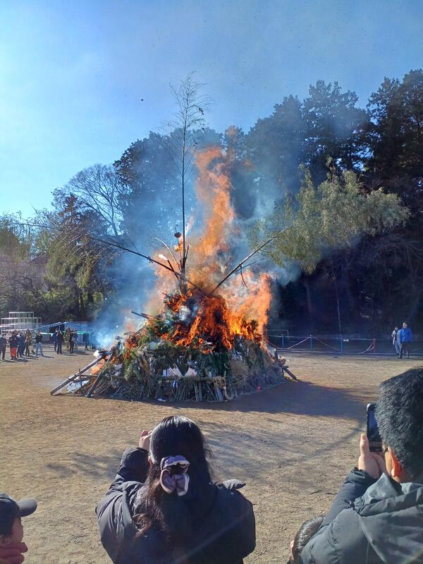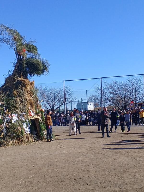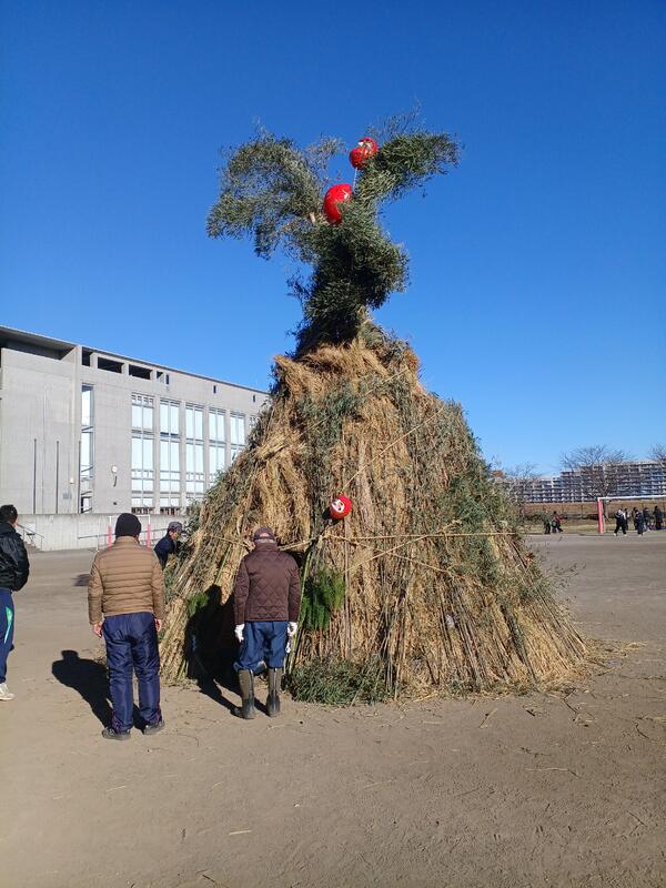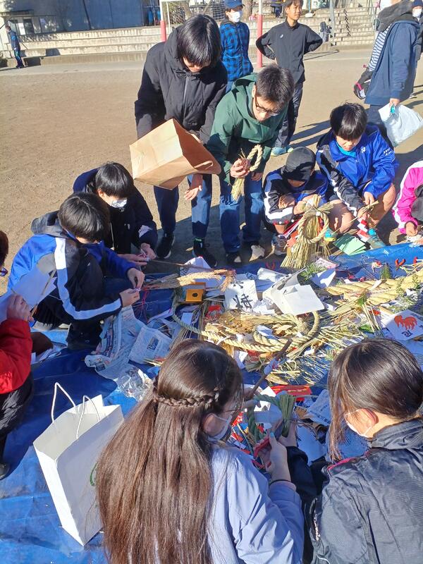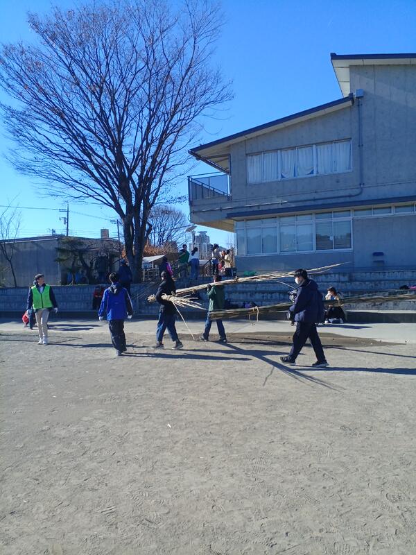 今日は第一小学校でのどんど焼きです。多摩中生もテニス部を中心に37名もの生徒がボランティアとして参加してくれています。点火の11時まで、受付・お飾りの分別・お団子準備などに分かれて作業に取り組んでくれています。