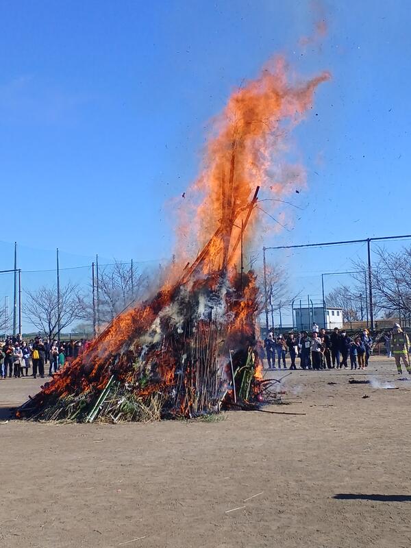 東寺方小学校で、どんど焼きが行われました。鼓桜さんの勇壮な太鼓演奏のもと、勢いよく燃え上がりました。