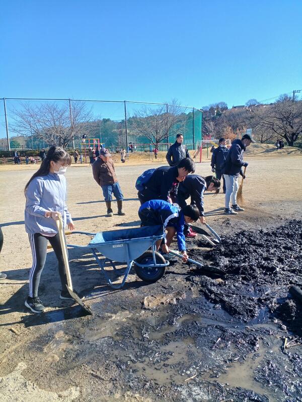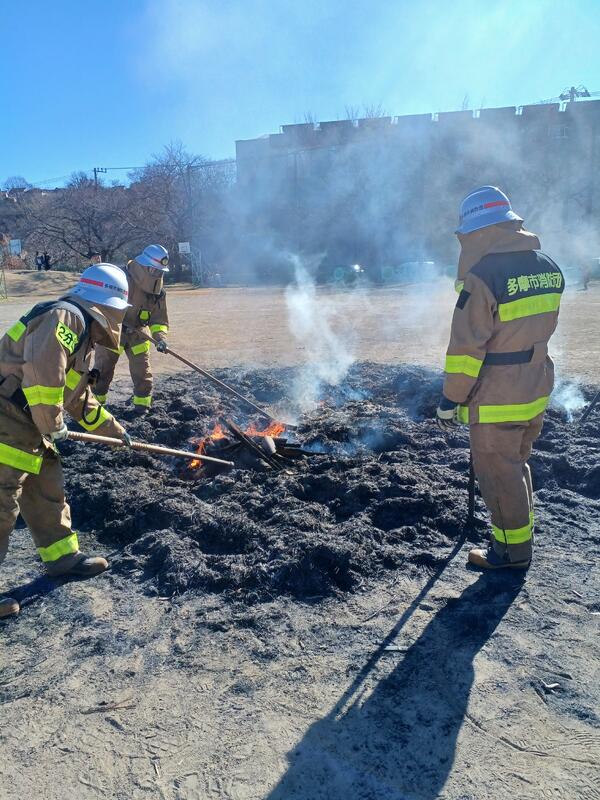 最後は燃え残りに水をかけ、鎮火した灰を運んだり、竹を運ぶ作業を行いました。