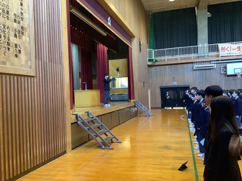 2年生の学年朝礼では、先日の鎌倉校外学習の振り返りとタブレット端末の使用についての再確認がありました。しっかりと前を向いて集中して話を聞いていました。
