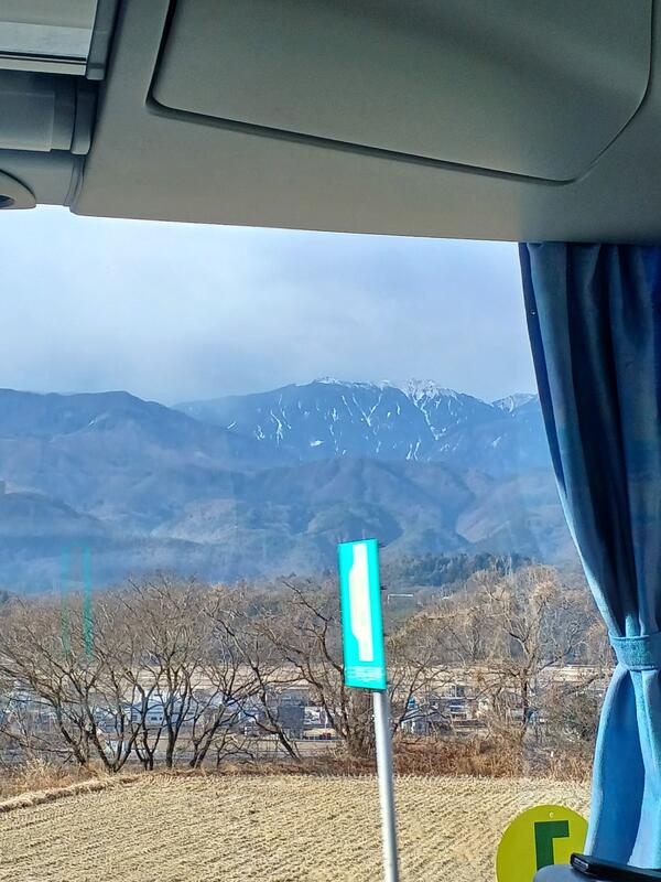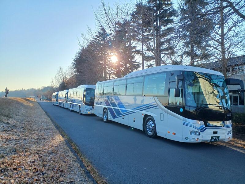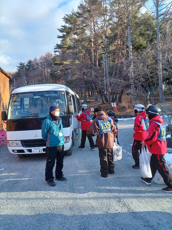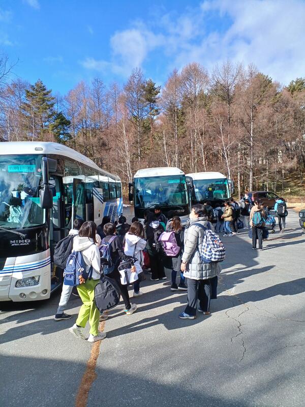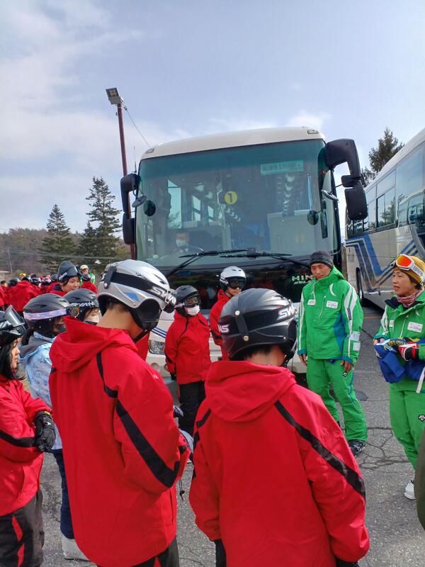 スキー場に向けてバスに乗り込みました。スキー場までは約10分です。現在の天気は曇りですが、午後には晴れる予報です。