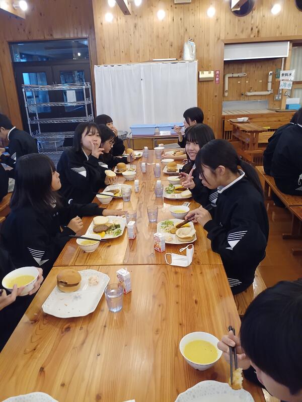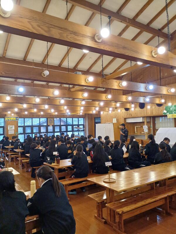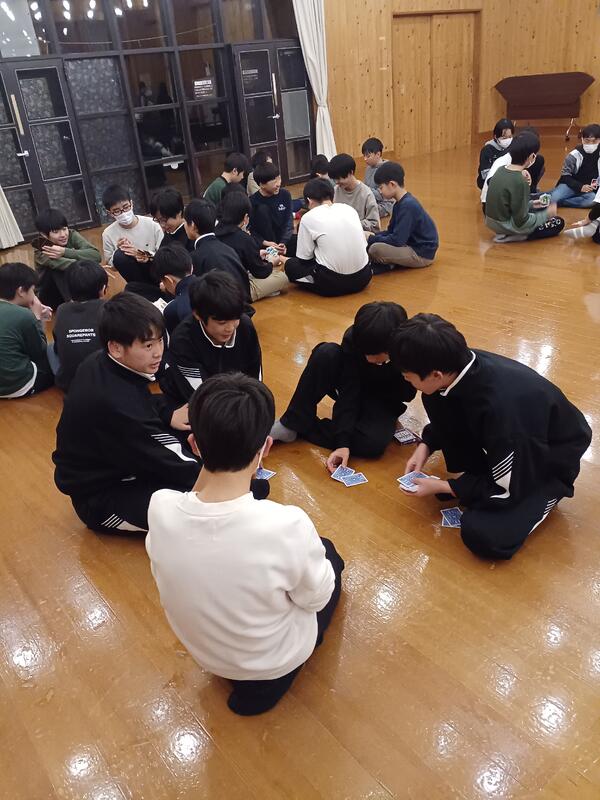 夕食後は、クラスごとに自由時間・風呂・夜食(クリームパンとオレンジジュース)。自由時間では、みんなホールに集まり、カードゲームに興じていました。なお、今日の配信はこの報告が最後になります。