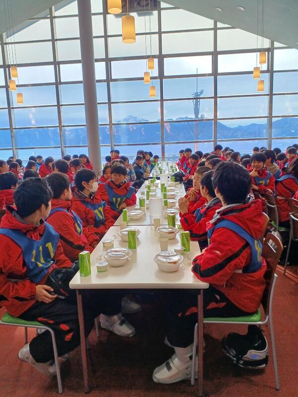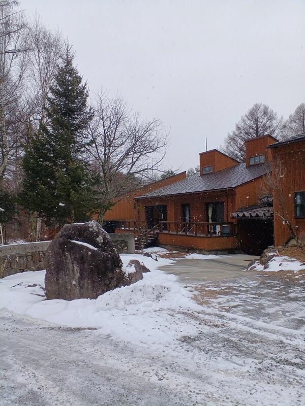昼食を終え、これからスキー場に向かいます。外は雪が降ってきました。