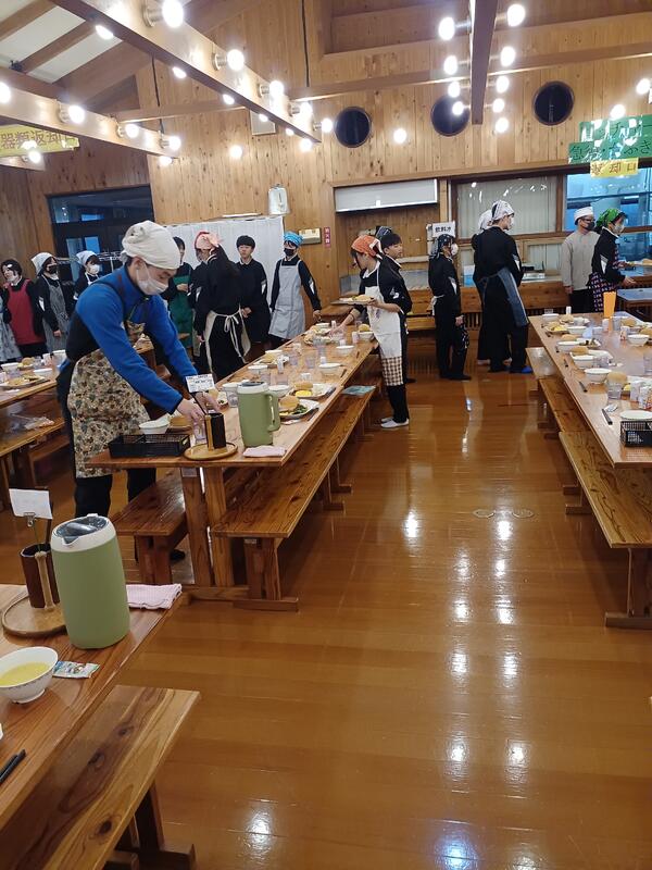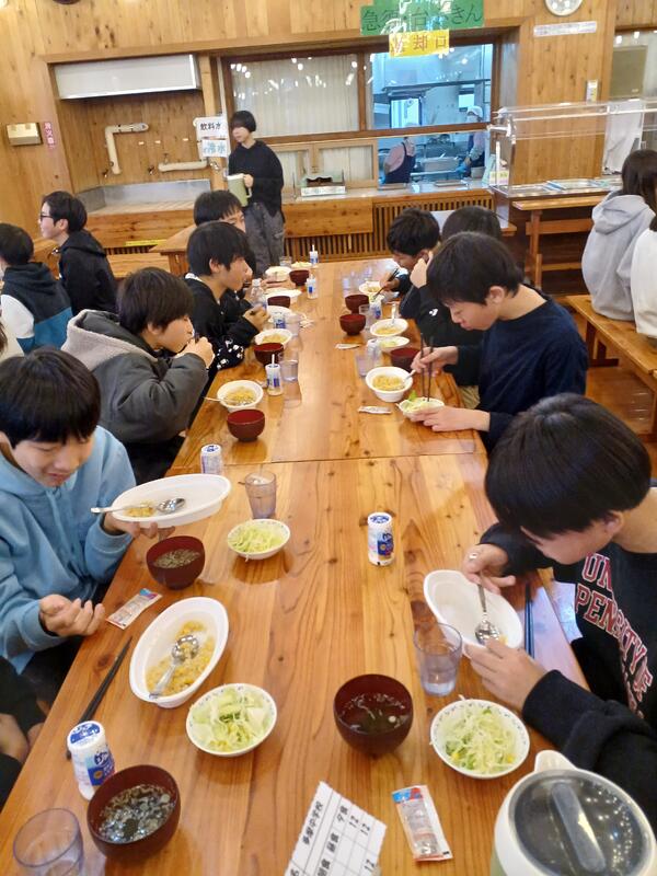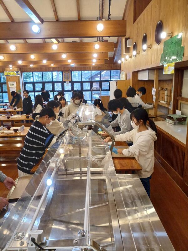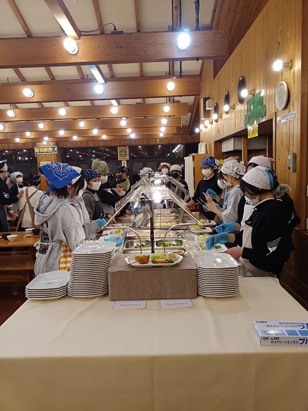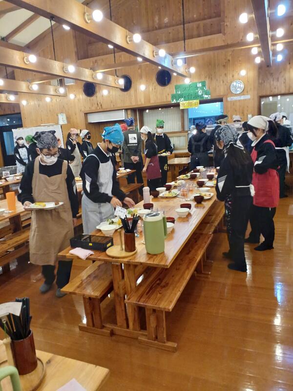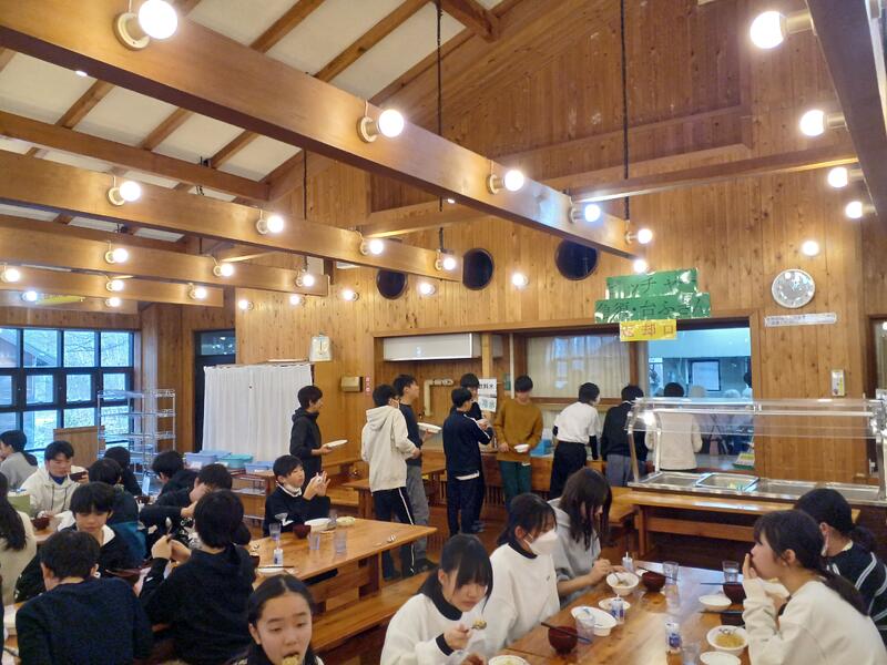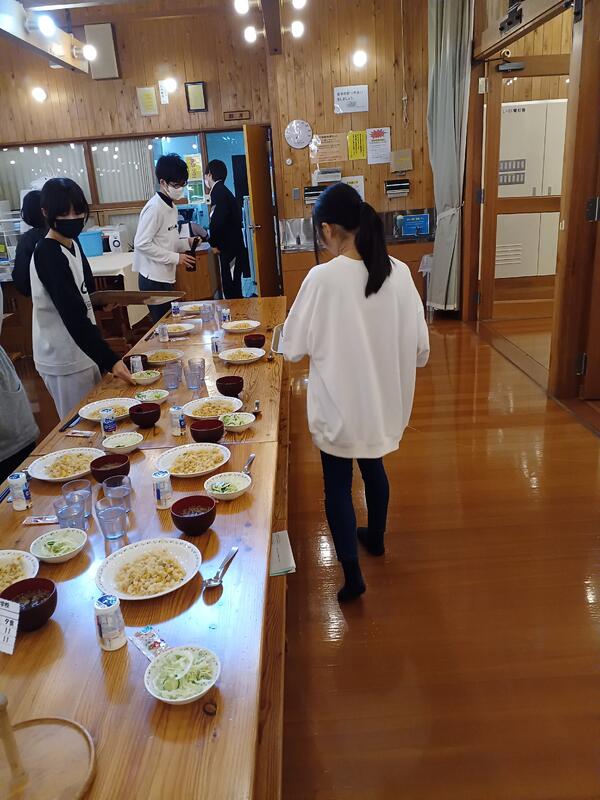 宿の食事はどれもとても美味しいものでした。今日もおかわりに何人も並びました。
