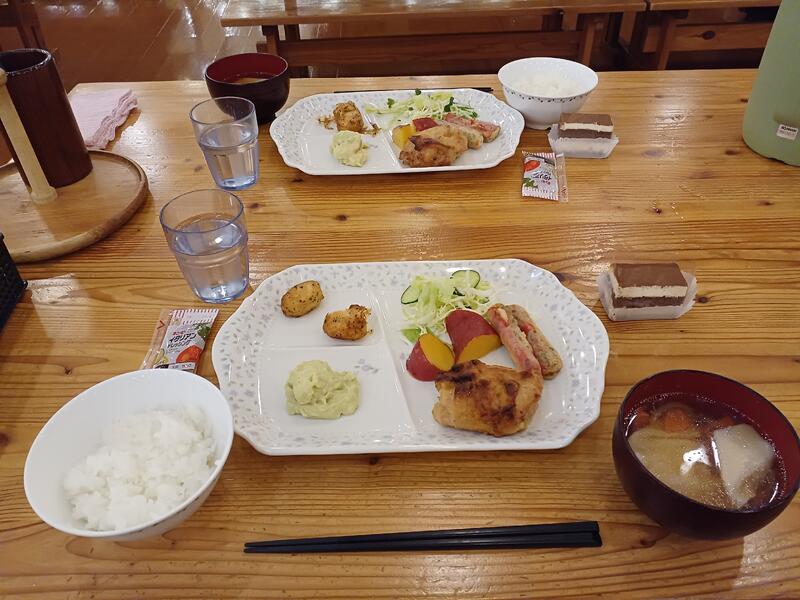 1日長いレッスンで疲れているにもかかわらず、今日も食事係が配膳を頑張ってくれました。今日の夕食のメニューは、鶏アスパラ巻きです。小さいながらもケーキがついてます。