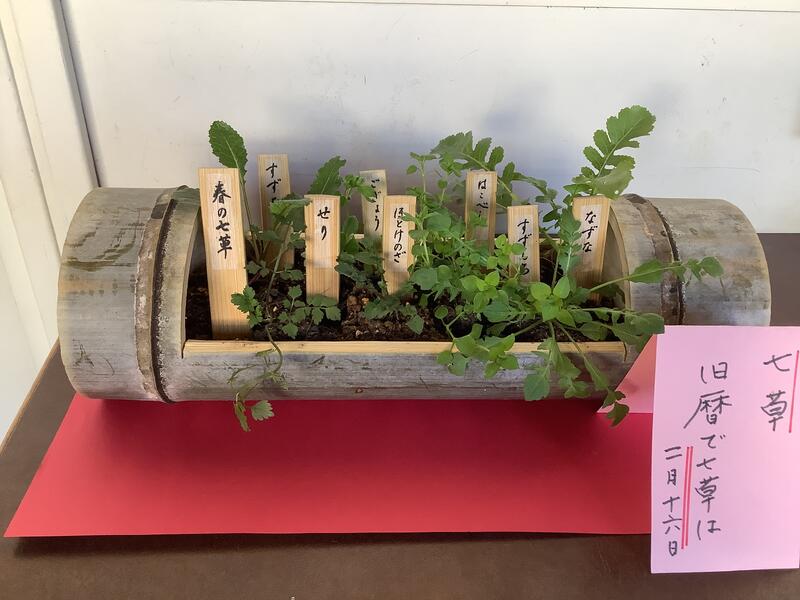 職員室前の廊下に春の七草が飾られています。季節感を感じることにつながるとともに、日本古来の風習や習慣を知る機会となることを期待します。