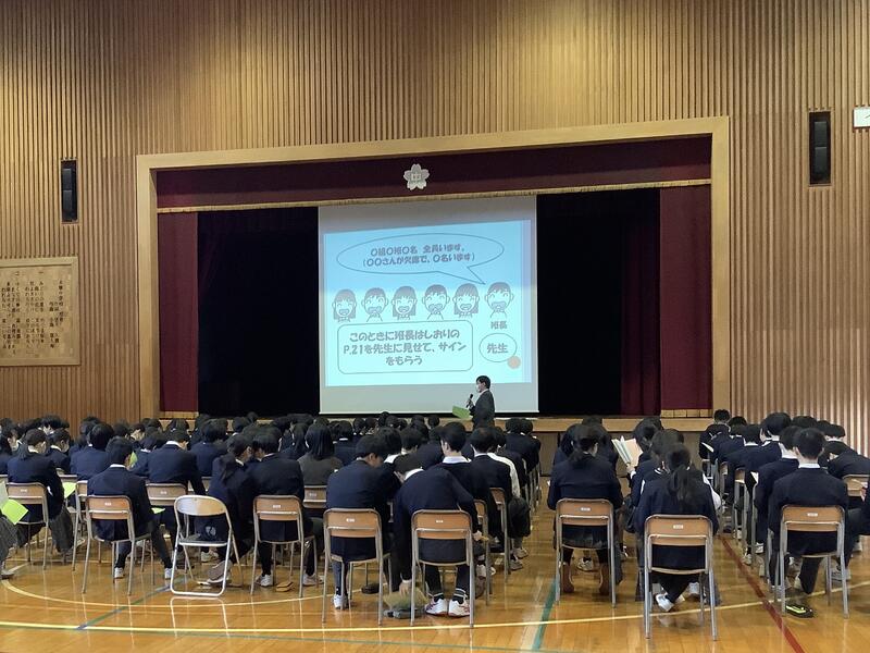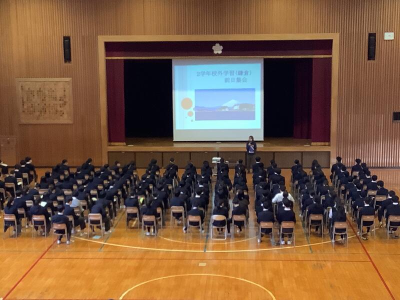 校外学習を明日に控え、最終確認が行われました。行き帰りの交通機関や班行動における注意点等について、学年主任の先生や担当の先生方から話しがあり、生徒は真剣な態度で聞いていました。明日は、楽しみながらもしっかりと学習をし、無事に帰ってくることを願っています。