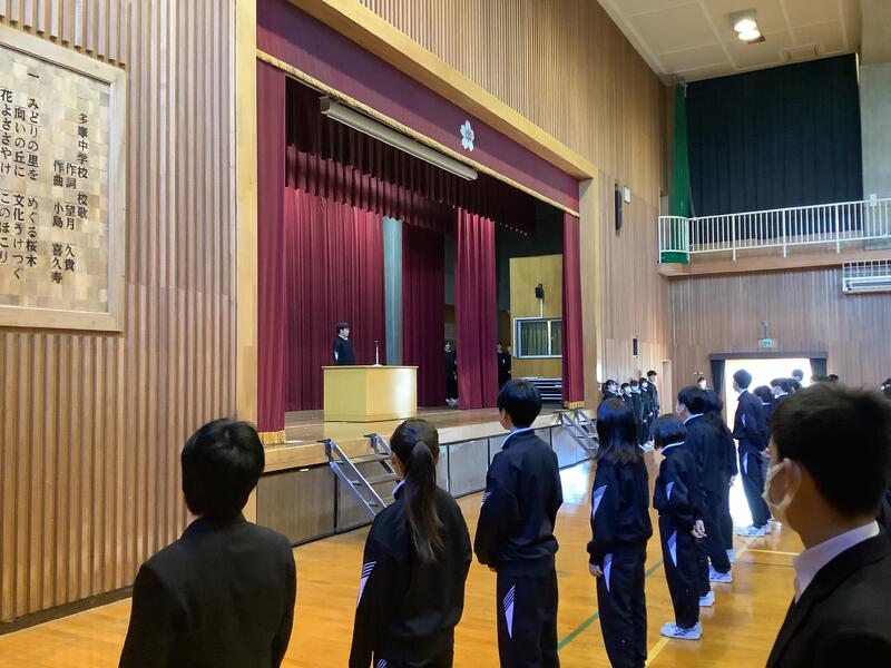 今日からの朝礼は、これまでのように各教室からクラスごとに並んで体育館に向かうのではなく、個人個人で体育館に集合して並ぶというスタイルをとることになりました。果たして、登校時には雪の影響もあり、上手くいくか心配されましたが、ほぼ時間通りに朝礼を始めることができました。さすが、多摩中生です。今後は、ただ時間に間に合うだけでなく、これを更にレベルアップしていってほしいと願っています。朝礼においては、人権作文コンテスト•陸上部•卓球部•吹奏楽部の表彰がありました。