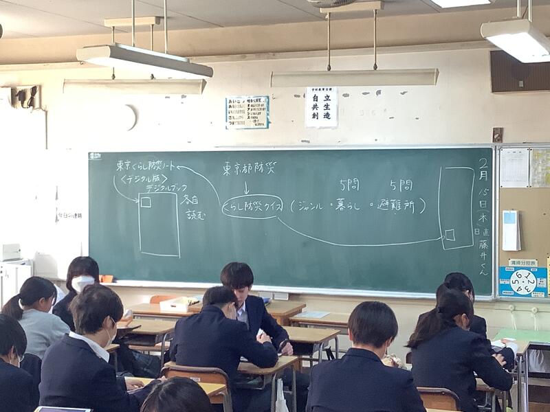今月の避難訓練は、タブレットで「東京くらし防災ノート」のアプリを利用して、災害時の行動や日頃の備えについて考えたり、緊急時に自分の命を守るための適切な行動がとれるよう学習しました。