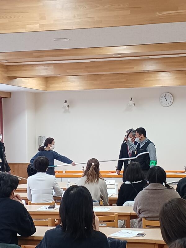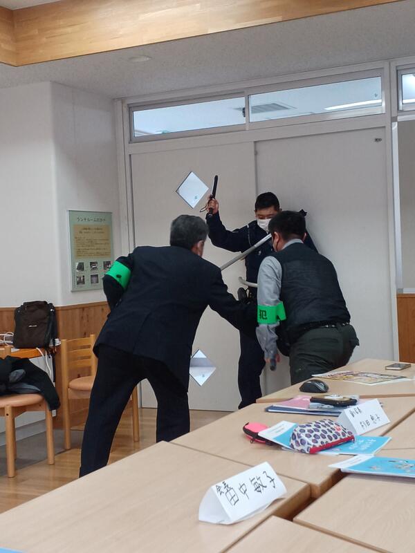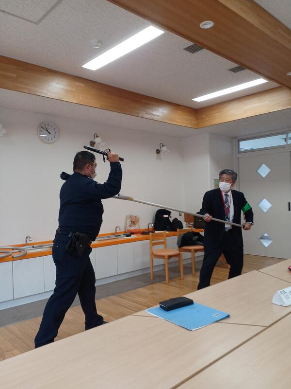 17日(土)に東寺方地区の青少協定例会が開催されました。本校のPTA校外委員の方や地域学校協働本部の方々など各団体からの報告の後、多摩中央警察署の方から防犯講演会が実施され、子供の見守りや特殊詐欺についてのお話の他、さすまたの使い方についてのレクチャーがありました。