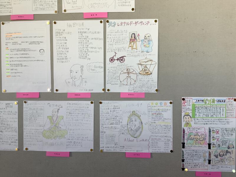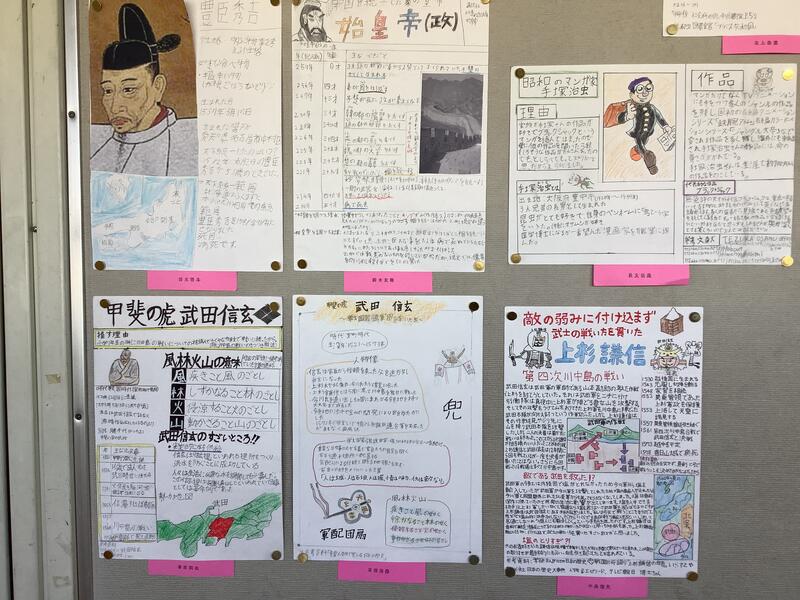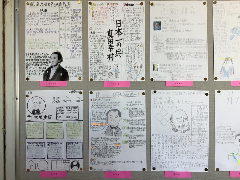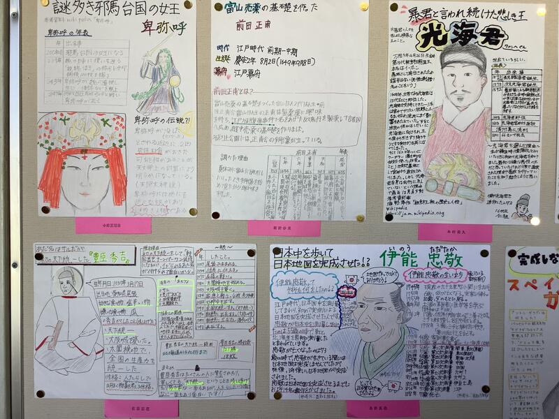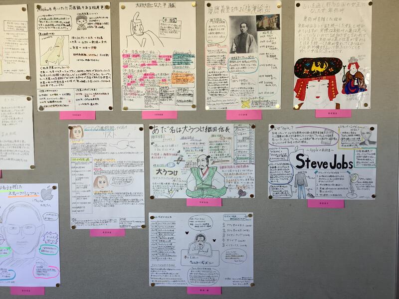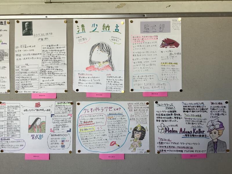 1年生の社会科で行った、歴史上のある一人の人物にスポットを当てて、その人物を新聞形式で紹介する課題が、1年生の廊下に掲示されています。その中から一部をご紹介します。様々な国•ジャンル•年代から数多くの人物が詳細に分かりやすく紹介されています。