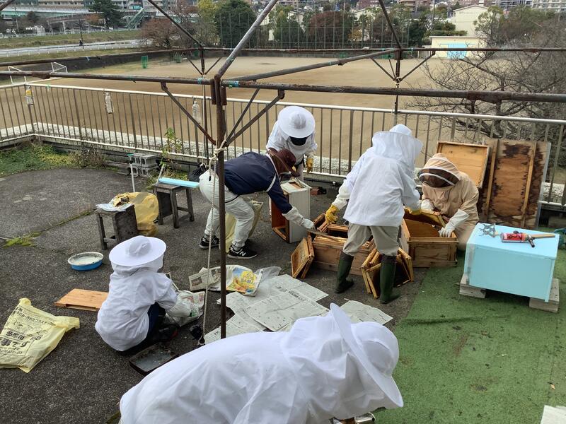 また、地域学校協働本部の皆様が、ミツバチのお世話をしてくださいました。具体的には、冬に向けた準備や、他の蜂による盗蜜後の巣箱の整理、そして蜂や巣箱の観察、確認作業などを丁寧に行っていただきました。いつもご尽力いただいており、深く感謝申し上げます。