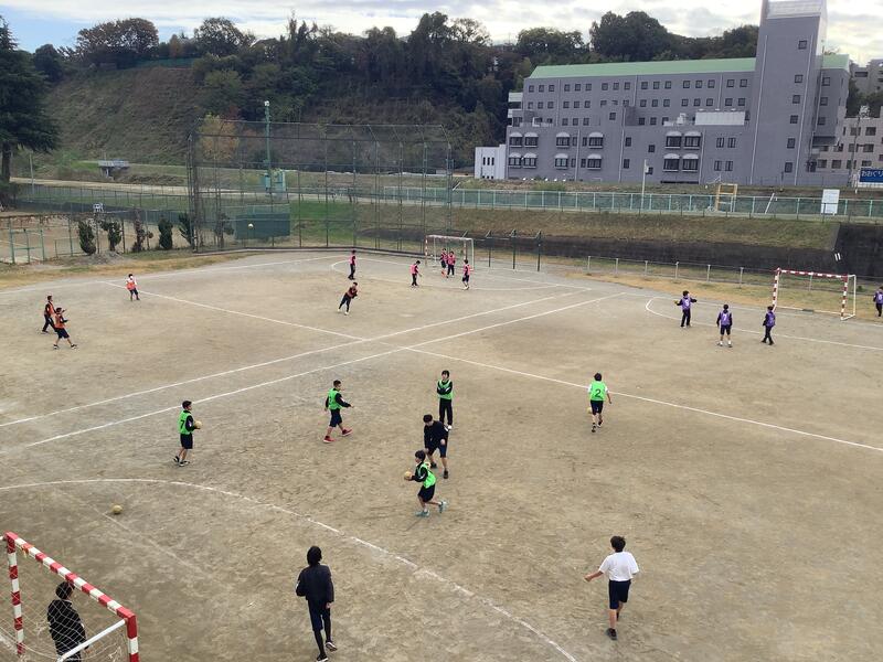 また、校庭ではハンドボールの学習が行われていました。パスからシュートへの一連の流れをチーム対戦方式の中で確認していました。ボールの操作だけでなく、個人の動きや立ち位置なども考えながらプレーしていました。