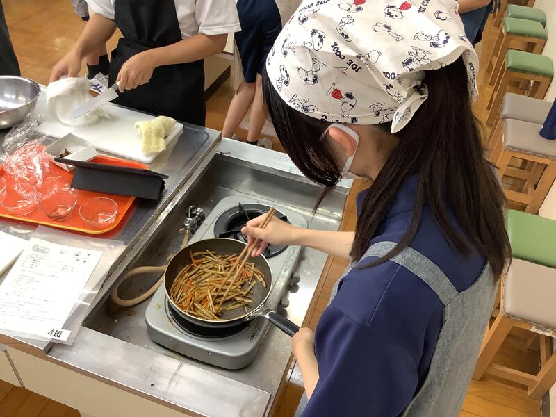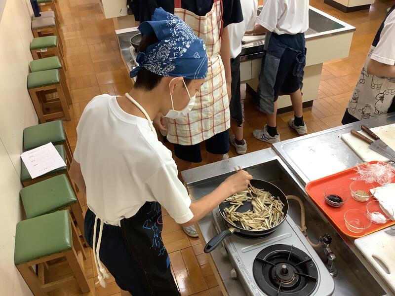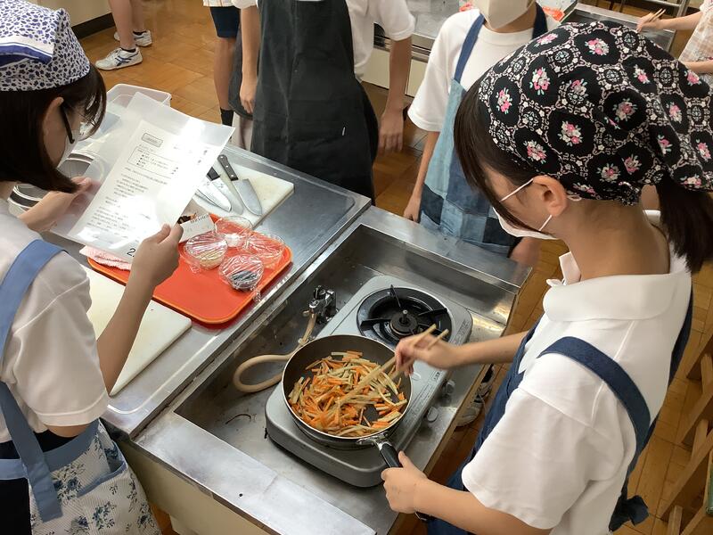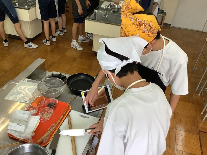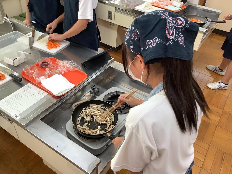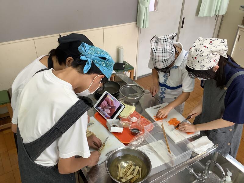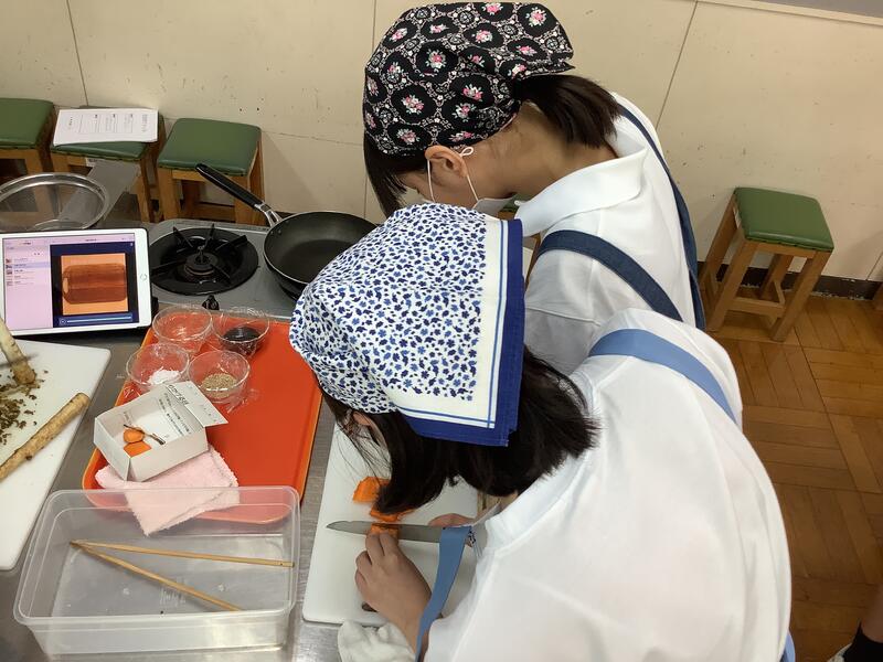 さて、3年生の家庭科の授業では調理実習が行われていました。手順を案内する動画や補助プリントも参考にしながら、きんぴらごぼうを調理していました。友達同士でも教えあったり協力したりしながら、楽しく一生懸命に取り組んいました。試食はどうだったかな。