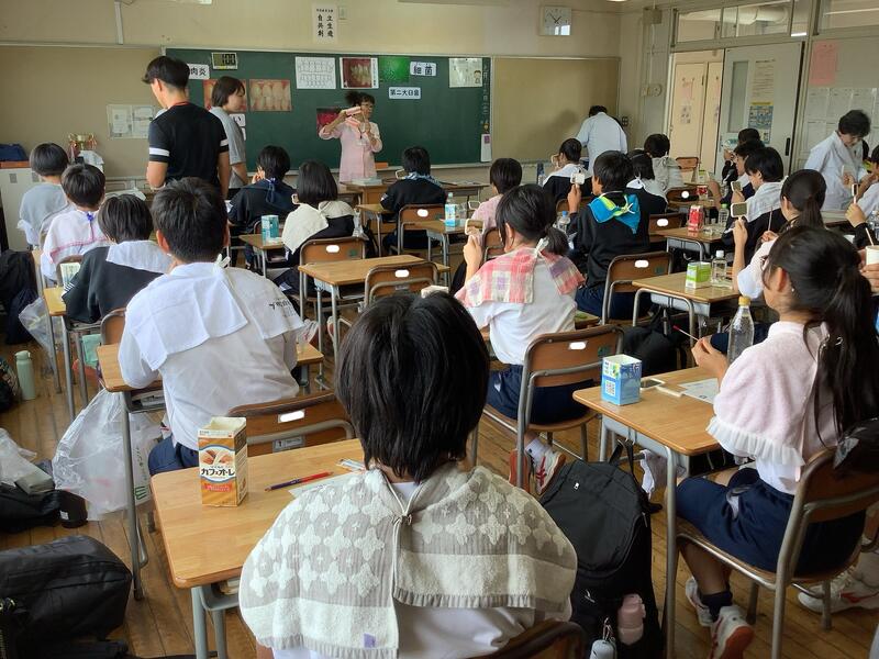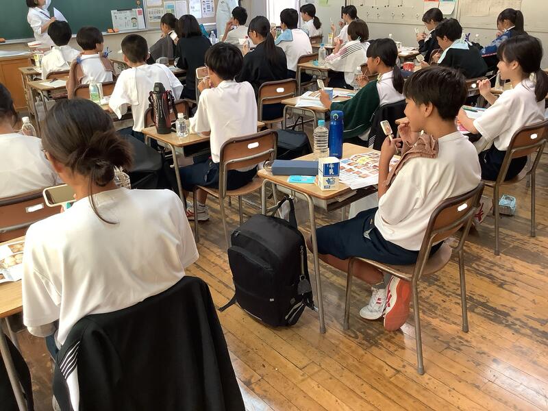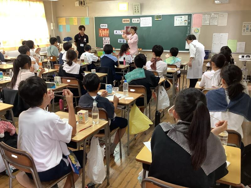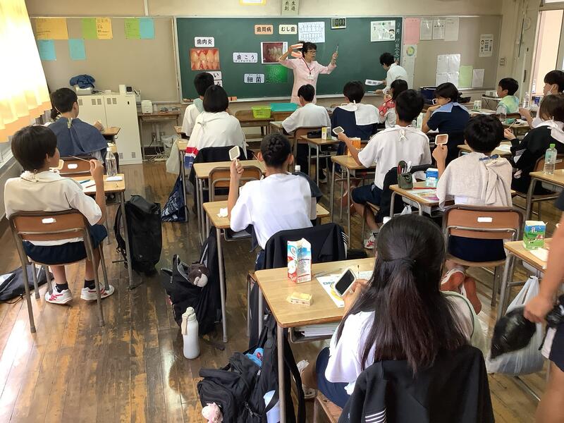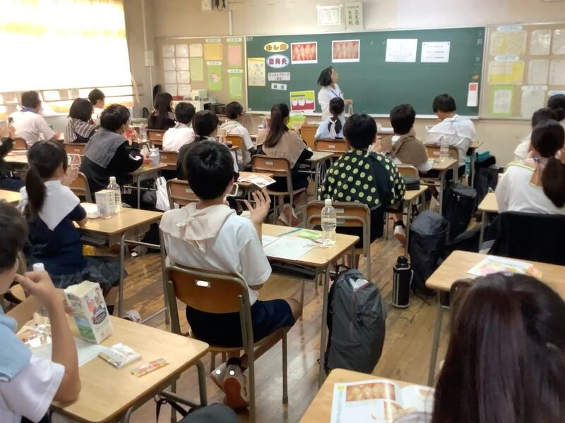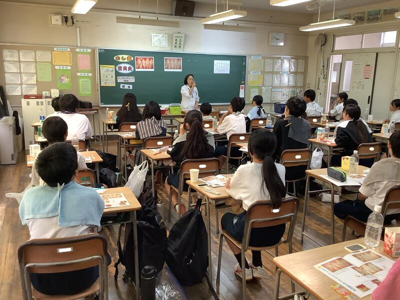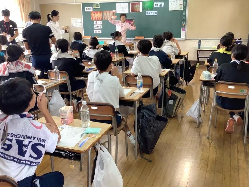 また、1年生はブラッシング指導が行われました。本校の歯科校医をはじめスタッフの皆様にご来校いただき、実演も交えて丁寧な指導をいただきました。大切な歯を守るために日頃から取り組むべきことを理解することができました。