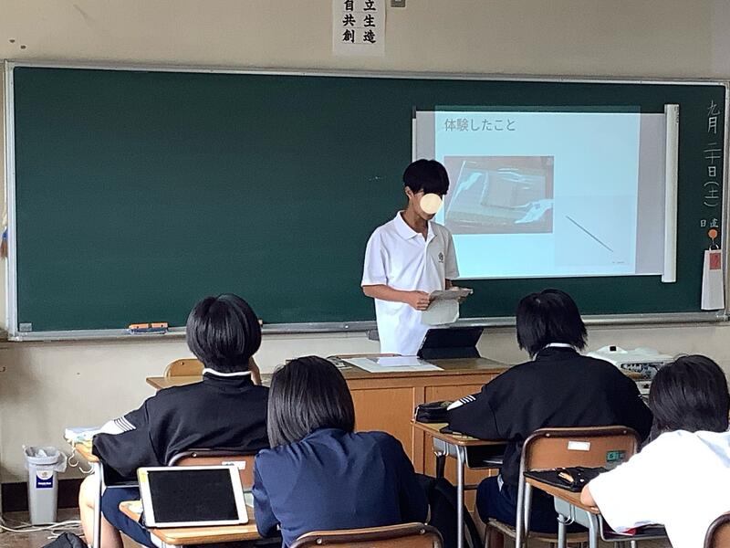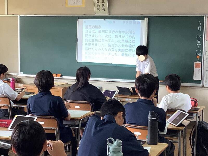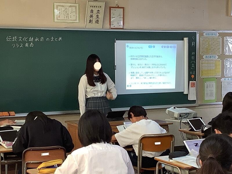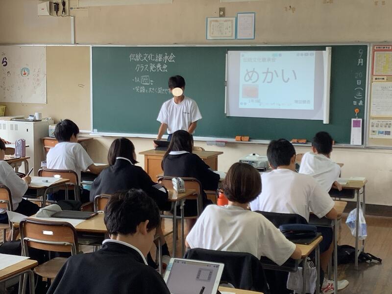 さて、1年生は7月に実施した伝統文化継承会のまとめの発表を行いました。各自が学んだ成果をまとめ、クラスの中で発表しました。緊張感もある中で一生懸命に頑張りました。