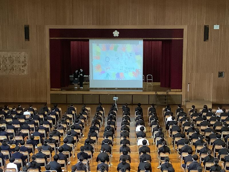 午後の時間に全校生徒が集まり生徒総会が行われてました。生徒会本部役員や各委員会の委員長からの活動目標や活動方針についての提案に対して、7人の生徒から質問や意見が出されました。各委員長からの適切な回答により、無事滞りなく終了することができました。生徒総会の後には、各クラスの学級目標の発表と体育祭のブロックの色分け抽選会が行われました。