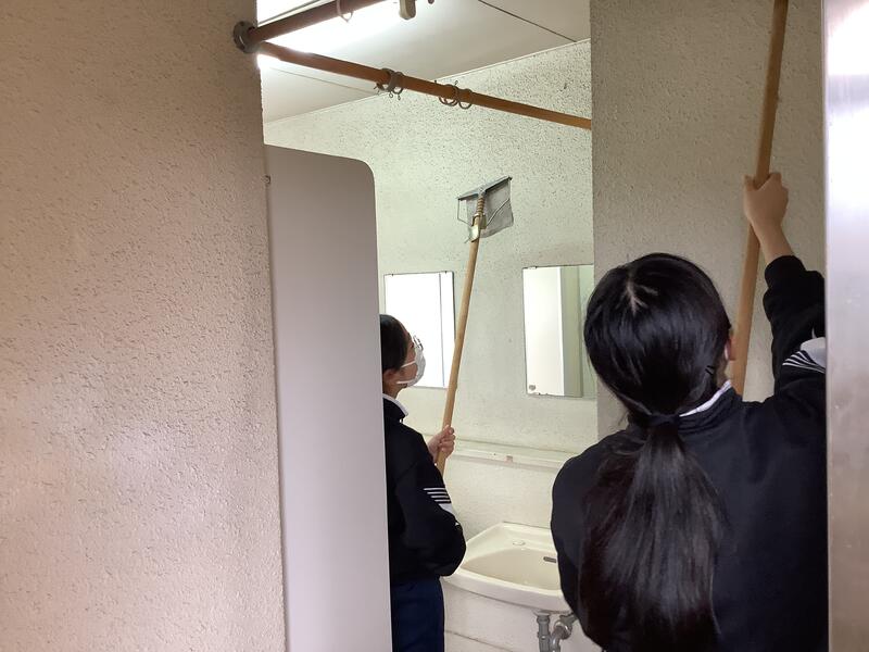 昨年度に引き続き今年度もトイレの壁をキレイに塗り替えることになりました。ボランティアを募ったところ、19名もの生徒が全校生徒のためになればと、自主的に参加してくれました。今日は、濡れた雑巾を使って拭き上げる作業でしたが、みんな嫌な顔をせずに、一生懸命取り組んでくれました。これで土曜日には、いよいよペンキを塗る作業に移れます。