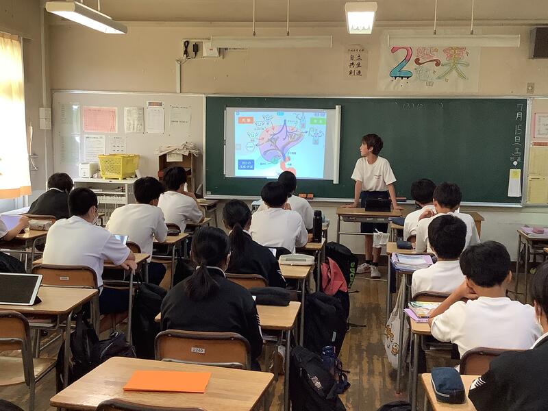 2年生の授業です。理科の授業では、人体について各自で調べたことをタブレットを使って発表し、お互いに評価しあっていました。