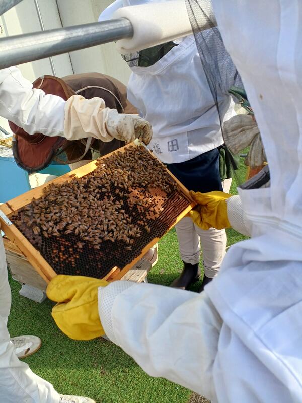 地域の専門家の方、地域学校協働本部の方々、地域の方、用務員さんがいらしてくださり、ミツバチの様子を確認してくださいました。今年は暖かいこともあり、順調に冬を越していました。校庭では、陸上部が一生懸命練習に励んでいました。