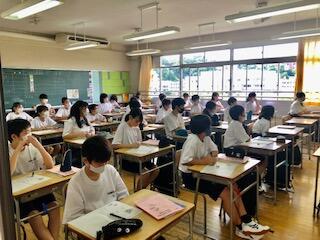 今日から、各教室ではクラス全体が揃って授業を受けています。グループワークなどはできませんが、教室の換気や空調を積極的に使いながら、マスクを着用しての学習です。