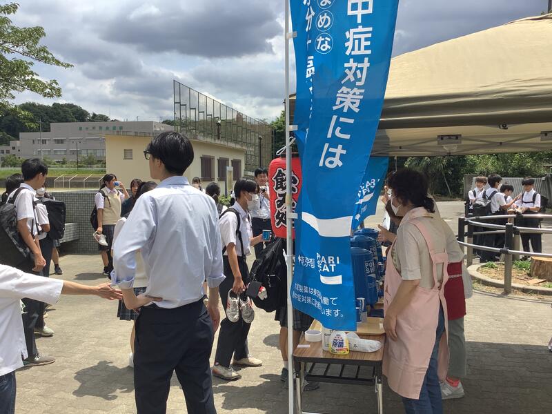 今年度2回目のドリンクバーとなりました。下校時に合わせ、地域学校協働本部とPTAの方々のご協力により、麦茶•スポーツドリンク•多摩中特製梅ジュースが大きなジャグに幾つも用意されました。気温が上がる中、生徒は冷たい飲み物に舌鼓を打っていました。協力していただいた方々へのお礼の言葉もしっかりと伝えられていました。