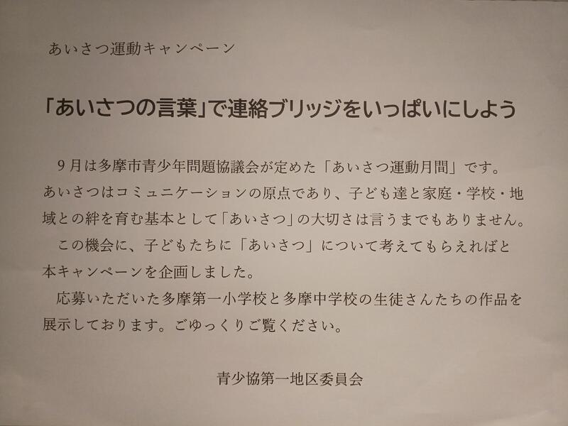 7月から9月まで多摩市のあいさつ運動キャンペーンになっています。その一環として、第一地区青少協によるあいさつ運動の取り組みがスタートしました。あいさつを呼びかけるポスターを美術部の部員が作成し、26日までせいせきショピングセンターの5階の連絡ブリッジに飾られています。みんな素晴らしい出来映えです。