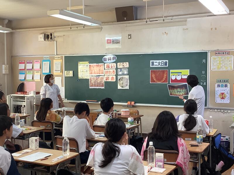 先日のF組に引き続き、今日は1年生がブラッシング教室を受講しました。前半は歯周病や虫歯の予防についてのお話しがあり、後半は染め出し液を使って歯磨きの状況(歯垢の残り具合)を確認しました。