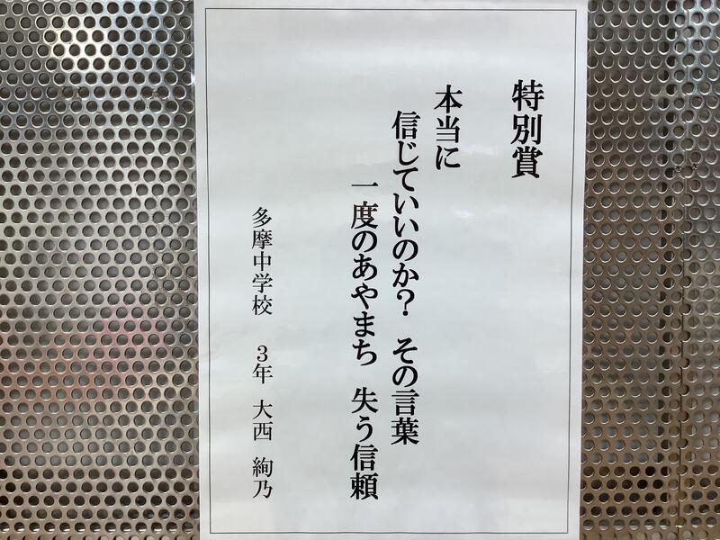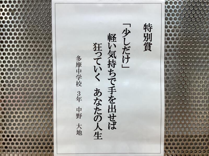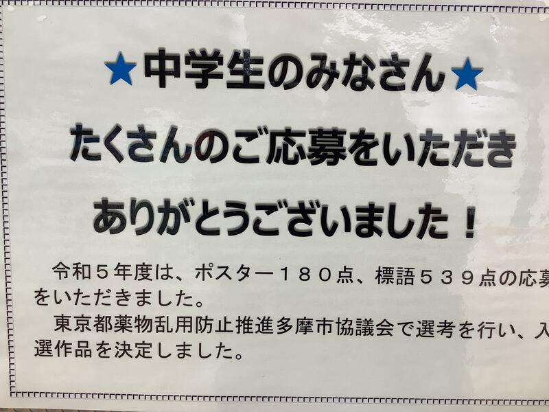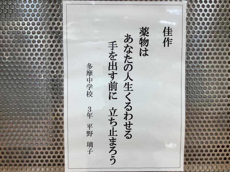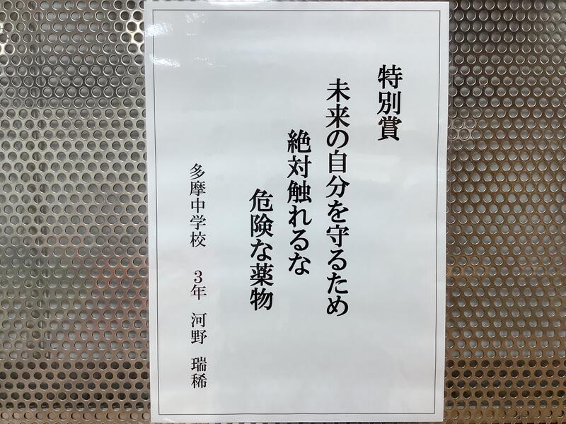 昨日21日より聖蹟ショッピングセンターの7階の連絡ブリッジに於いて、薬物乱用防止標語とポスターの展示会が始まっています。本校からは3年生が標語のコンクールにエントリーし、多くの入賞を果たしました。