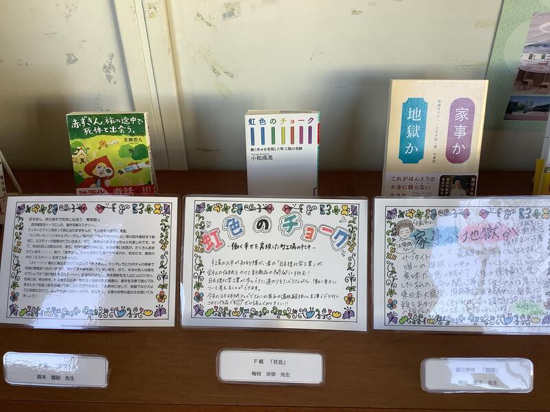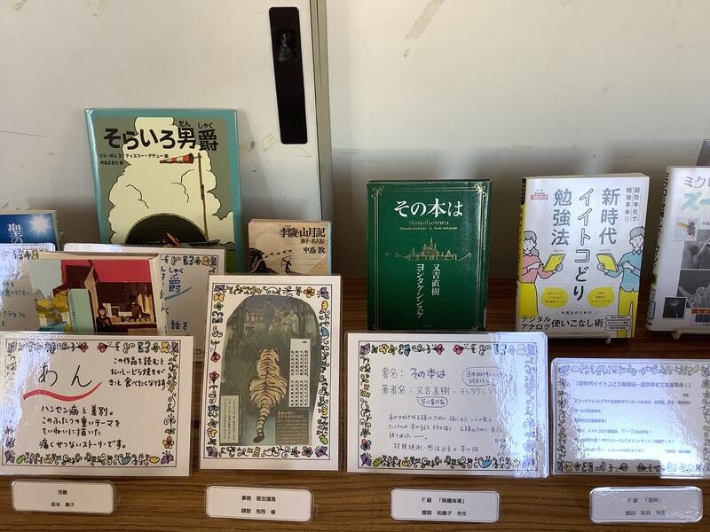 図書司書の坂本さんの尽力によって、先週より図書室前の廊下に様々な本を紹介したPOPとともに、本が展示されています。全ての先生方からの33冊もの本の案内です。きっと、それぞれに合った本が見つかると思います。