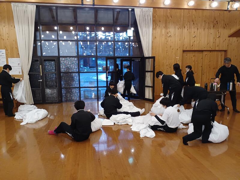 朝の会では、軽い体操と緒連絡を受けました。そのあとは、「来た時よりも美しく」のモットーのもと、施設内の清掃を行いました。