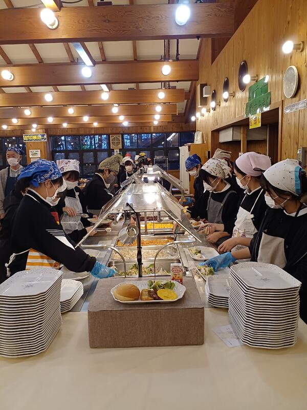 今日も食事係は大活躍です。今日のメニューは、ハッシュポテト・ハンバーグ・オムレツ・サラダです。